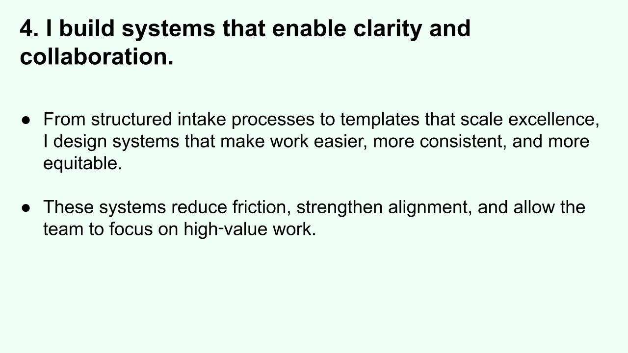 I design structures that make work easier, more consistent, and more equitable because clarity is foundational to success.